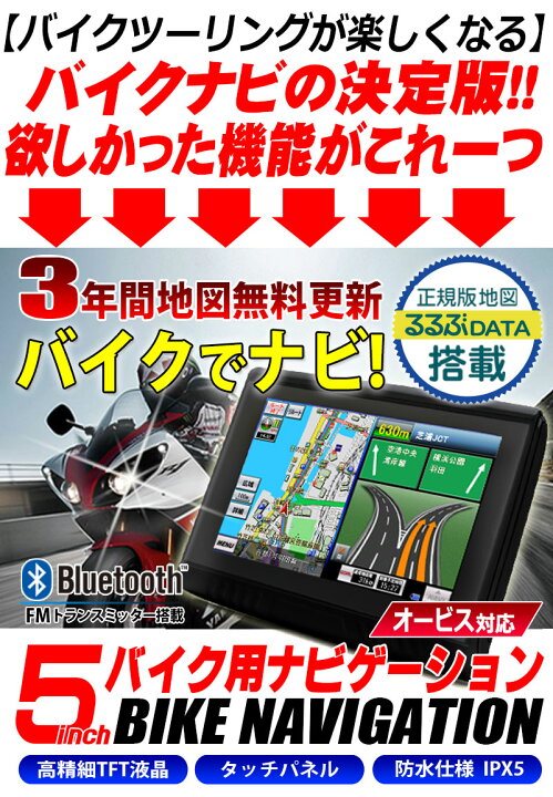 楽天市場 バイク用ナビ 5 0型 タッチパネル 22年地図データ 最新年度 るるぶ 3年間 地図 更新無料 防水 ポータブル Bluetooth Microsd Usb 充電 日本語マニュアル バイクナビ ポータブルナビ カバー マウント 付き 小さい コンパクト 5インチ 12v バッテリー電源